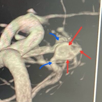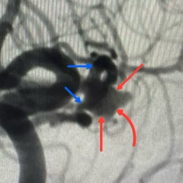 هتلاقوا كمان سهمين زرق 🔵… دول بيوضحوا الشريانين الطبيعيين اللي طالعين جنب التمدد مباشرة. التمدد ده طالع من منطقة تفريعية بين الشريانين، وده معناه إن أي خطأ بسيط ممكن يؤدي إلى قفل أحد الشرايين… وممكن ده يسبب جلطة في المخ.